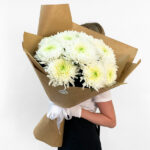 Ми поєднали розкішні одноголові хризантеми з лаконічним крафт-папером, що підкреслює природну красу пелюсток і надає букету сучасного вигляду. Світла флористична стрічка гармонійно завершує ансамбль, роблячи його легким та повітряним. Ви можете замовити квіти для колеги, вчителя або близької людини, адже білий колір завжди несе в собі світло та позитивну енергію.