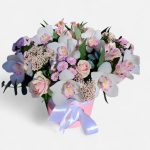 Королівські орхідеї цимбідіум із ніжними рожевими акцентами є центром ансамблю, символізуючи витонченість та шляхетність. Багата палітра пудрових троянд, тендітних альстромерій та повітряних хризантем створює неймовірний об’єм та гармонійний колірний перехід. Суцвіття сизого евкаліпта додають композиції сучасної динаміки та легкої ароматної свіжості. Рішення замовити квіти у такому виконанні — це гарантія того, що ваш подарунок виділятиметься серед інших своєю текстурною вишуканістю та стилем.