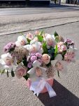 Багата палітра ніжних відтінків: Пудрові троянди, тендітні альстромерії та повітряні хризантеми створюють неймовірний об’єм та гармонійний колірний перехід.