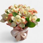 Головним акцентом композиції виступають розкішні орхідеї Цимбідіум. Їхні воскові пелюстки ніжного кремового кольору з контрастною бордовою серцевиною додають букету екзотичного шарму. М’якості та візуального об’єму додають персикові гвоздики (діантуси), чий теплий відтінок ідеально перекликається з орхідеями, а соковите зелене листя підкреслює природну свіжість кожної квітки. Багато клієнтів воліють замовити квіти саме у такому форматі, адже вони не потребують вази — рослини вже знаходяться у спеціальній флористичній губці з водою.